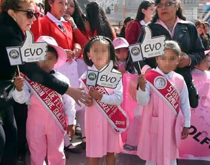 La Ley 026 de Régimen Electoral y el Código Niño, Niña Adolescente prohíbe el uso de niños en actos políticos.