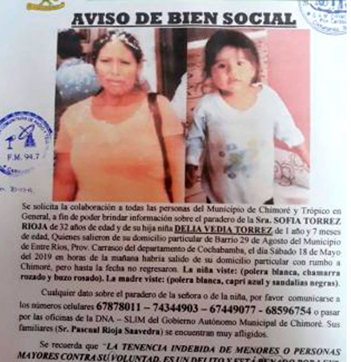 “Se solicita la colaboración a todas las personas del Municipio de Chimoré y Trópico en general a fin de poder brindar información sobre el paradero de la Sra Sofía Torrez Hinojosa de 32 años de edad y de su hijita niña Delia Vedia Torrez de 1 año y siete meses de edad, quienes salieron de su domicilio particular del Municipio de Entre Ríos Prov. Carrasco del departamento de Cochabamba el día sábado 18 de mayo en horas de la mañana. (La mujer) habría salido de su domicilio particular con rumbo a Chimoré”, dice parte del comunicado.