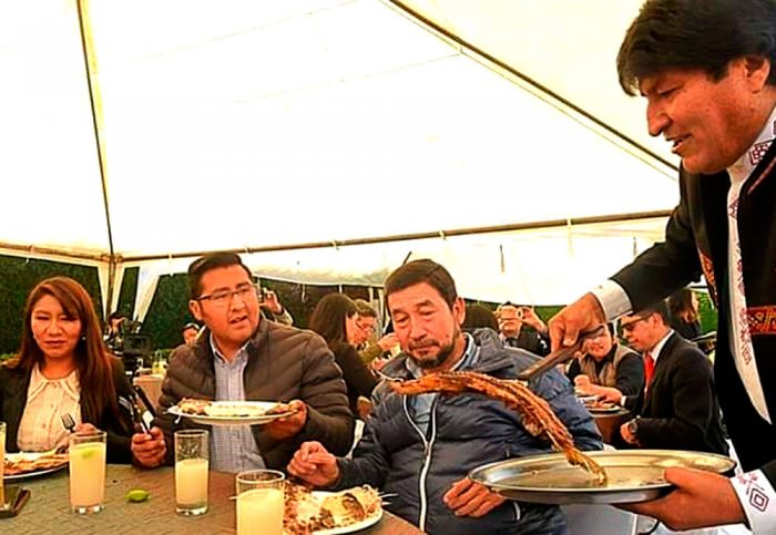 El anfitrión, en este caso el Presidente, se ve muy atento sirviendo un platillo de feriado, por los 210 años de la efeméride La Paz.