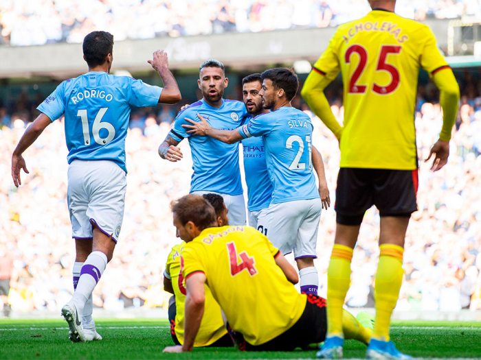 Kun Agüero de penalti, Mahrez de falta, Bernardo Silva de cabeza y Otamendi en acción de estrategia ponían goles al vendaval del City ante la locura de la afición que acudió al Etihad Stadium. EFE