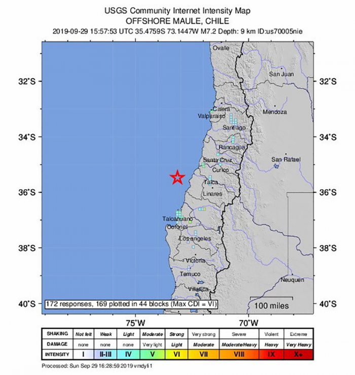El movimiento telúrico se registró a las 12.57 hora local (15.36 GMT) y su epicentro se localizó a 70 km al oeste de Constitución, ciudad de la región del Maule, ubicada a unos 370 kilómetros al sur de Santiago, informó el Centro Sismológico Nacional.