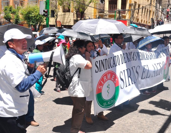 La autoridad señaló que la dirigencia del sector salud ejercería presión sobre galenos afiliados al Colegio Médico de Bolivia, esto para que los mismos se adhieran a las marchas, al paro de actividades o a la huelgas de hambre; estas situaciones se habrían dado en Santa Cruz y Potosí.