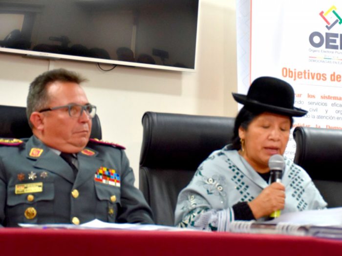En conferencia de prensa conjunta con los vocales del Tribunal Supremo Electoral (TSE), el comandante de las Fuerzas Armadas, Williams Kaliman Romero, informó que ambas instituciones firmaron el acuerdo “Plan de operaciones, Elecciones 2019” a través del cual los militares brindarán seguridad a toda la jornada electoral, desde la custodia de imprentas de material, el almacenamiento de papeletas, hasta el traslado de los sobres de seguridad en los cuales estarán las actas que certifican el conteo de votos de las mesas de sufragio.