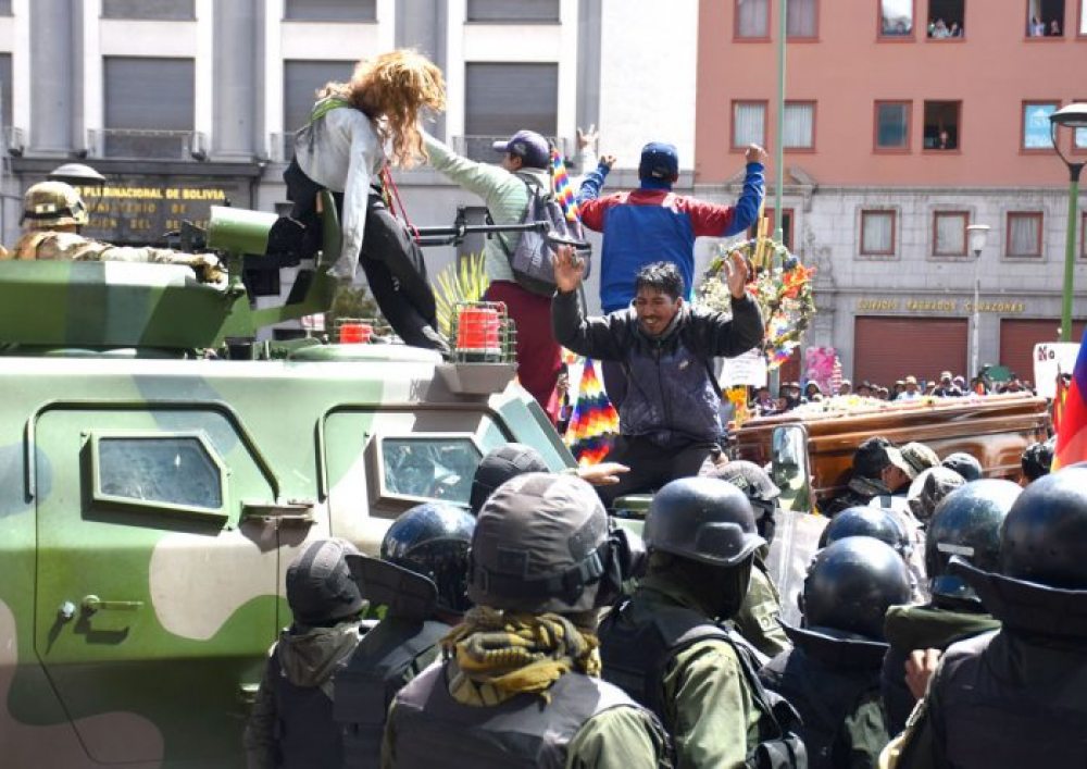Una marcha de pobladores afines al MAS que viven en Senkata, militantes de El Alto y familias de los fallecidos durante la toma y fallido intento de hacer explotar la planta de Yacimientos Petrolíferos Fiscales Bolivianos (YPFB); ayer llegaron hasta el centro de La Paz e irrespetaron a sus difuntos y a las Fuerzas Armadas.