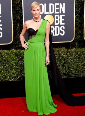 5. Charlize Theron lució un vestido bicolor en verde y negro con bustier by Christian Dior y capa a tono. Completó su look con una gargantilla con esmeralda y brillantes.
