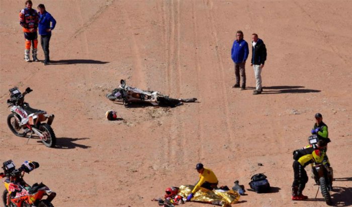 “Sí, estaba en una gran pista rápida a todo gas. La lámpara del GPS se me apagó y vi una moto tendida en la distancia, y nunca es bueno porque era una zona de alta velocidad. Al llegar me encontré a Paulo en el suelo. Primero no sabía muy bien quién iba y luego rápidamente me di cuenta de que era él. Inmediatamente vi que era algo bastante serio e intentamos que respondiese y llamamos a los helicópteros e informar al control de carrera cuanto antes”, contó el piloto.