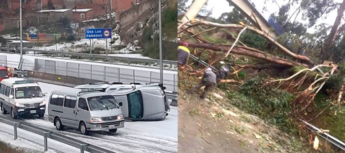 Según fotografías difundidas en redes sociales, el granizo que cayó ayer entre las 12.00 y 13.30 horas en la ciudad de La Paz causó un accidente de tránsito con daños materiales considerables, provocó el vuelco de una camioneta en la autopista que une las ciudades de La Paz y El Alto y posteriormente se produjo la caída de un enorme árbol de eucalipto en esa misma vía.