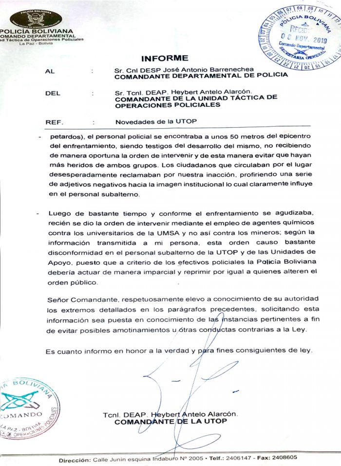 Un informe policial enviado por el entonces comandante de la Unidad Táctica de Operaciones Policiales (Utop), Heybert Antelo, al jefe departamental de la Policía, José Antonio Barrenechea, denunció que la Policía tenía órdenes de resguardar solo a grupos afines al Movimiento Al Socialismo (MAS).