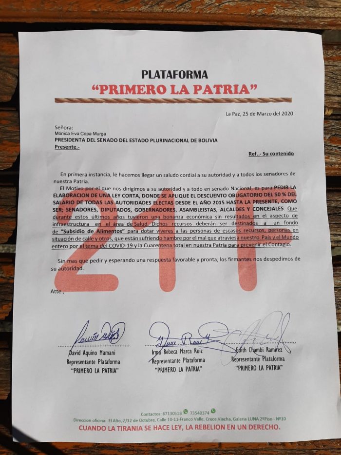 La plataforma ciudadana pide a parlamentarios y otras autoridades electas donar el 50% de sus salarios para crear un fondo que apoye a personas de escasos recursos y en situación de calle durante el tiempo que dure la emergencia sanitaria por la propagación del coronavirus en Bolivia.