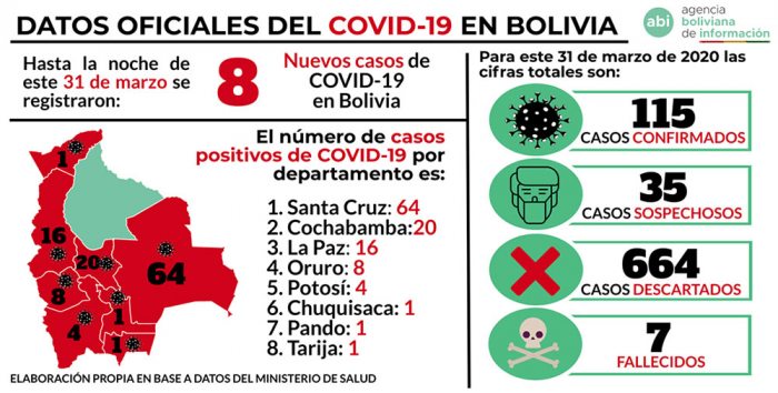 Con los ocho nuevos casos de coronavirus en los departamentos de Santa Cruz, La Paz y Potosí, el número de casos confirmados se elevó a 115 en todo el país, según el último reporte del ministro de Salud, Aníbal Cruz.