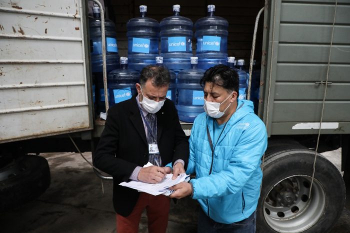 El Fondo de las Naciones Unidas para la Infancia (Unicef), en el marco de su respuesta ante la pandemia por coronavirus en Bolivia, entregó este jueves al Ministerio de Medio Ambiente y Agua (MMAyA), 4.400 litros de agua y otros suministros de higiene y saneamiento, así como de protección e información, para los aproximadamente 480 bolivianos que retornaban de Chile y que actualmente se encuentran en el albergue “Tata Santiago” en la zona fronteriza de Pisiga.
