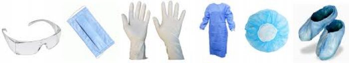 BARRERAS FÍSICAS: Estos equipos incluyen las barreras primarias y son dispositivos que garantizan la seguridad al realizar un procedimiento. Estos son denominados equipos de protección personal; entre ellos tenemos guantes, zapatos, mascarillas o cubrebocas, gorros, batas, gafas, mandiles entre otros. Los de uso más frecuente son los siguientes: