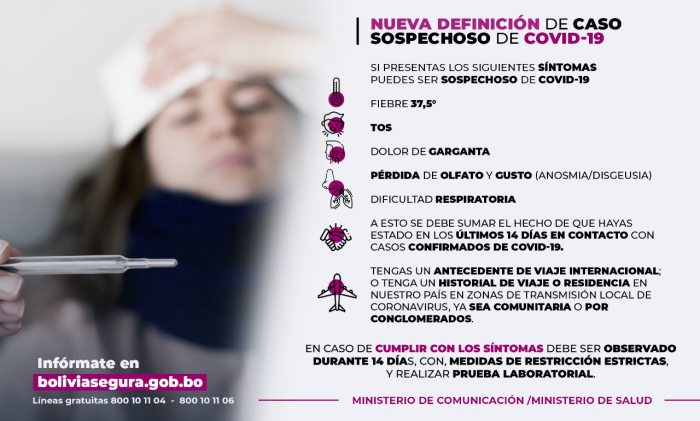 Recomendamos a toda la población boliviana que, en caso de tener alguna sospecha de contagio, llame en primera instancia a los números gratuitos 800101104 y 800101106, para pedir asistencia médica y protocolos sobre cómo proceder frente a alguno de los síntomas señalados", finaliza el comunicado.