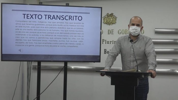 “Compañeros del MAS, indígenas, hay que armarse, hay que levantar las armas, que tenemos guardado, porque este Murillo ya no merece vivir en este mundo, para qué sirve esta persona diabólica, es un satanás, es una bestia, no es humano, hay que nomás liquidarlo de una vez porque ya es hora (…)”, se escucha en el audio que fue presentado hoy en conferencia de prensa.