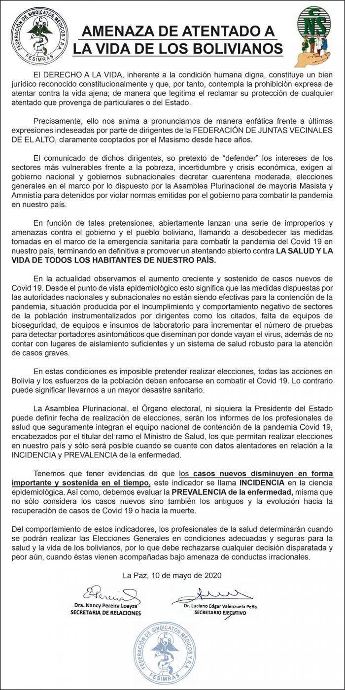 En función de tales pretensiones, abiertamente lanzan una serie de improperios y amenazas contra el gobierno y el pueblo boliviano, llamando a desobedecer las medidas tomadas en el marco de la emergencia sanitaria para combatir la pandemia del Covid 19 en nuestro país, terminando en definitiva a promover un atentando abierto contra LA SALUD Y LA VIDA DE TODOS LOS HABITANTES DE NUESTRO PAÍS.