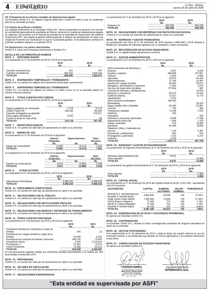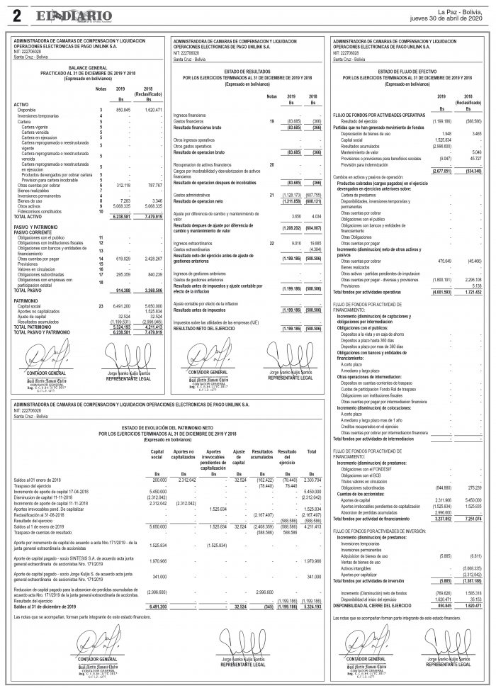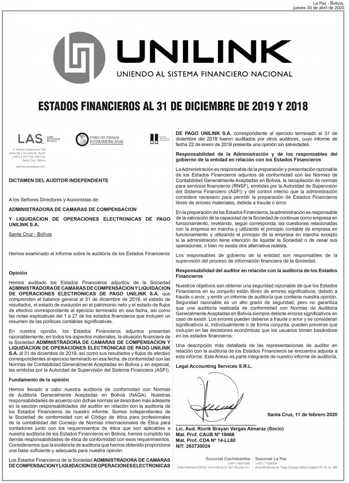 Hemos auditado los Estados Financieros adjuntos de la Sociedad ADMINISTRADORA DE CAMARAS DE COMPENSACION Y LIQUIDACION DE OPERACIONES ELECTRONICAS DE PAGO UNILINK S.A. que comprenden el balance general al 31 de diciembre de 2019, el estado de resultados, el estado de evolución en el patrimonio neto y el estado de flujos de efectivo correspondiente al ejercicio terminado en esa fecha, así como las notas explicativas del 1 a 27 de los estados financieros que incluyen un resumen de las políticas contables significativas.