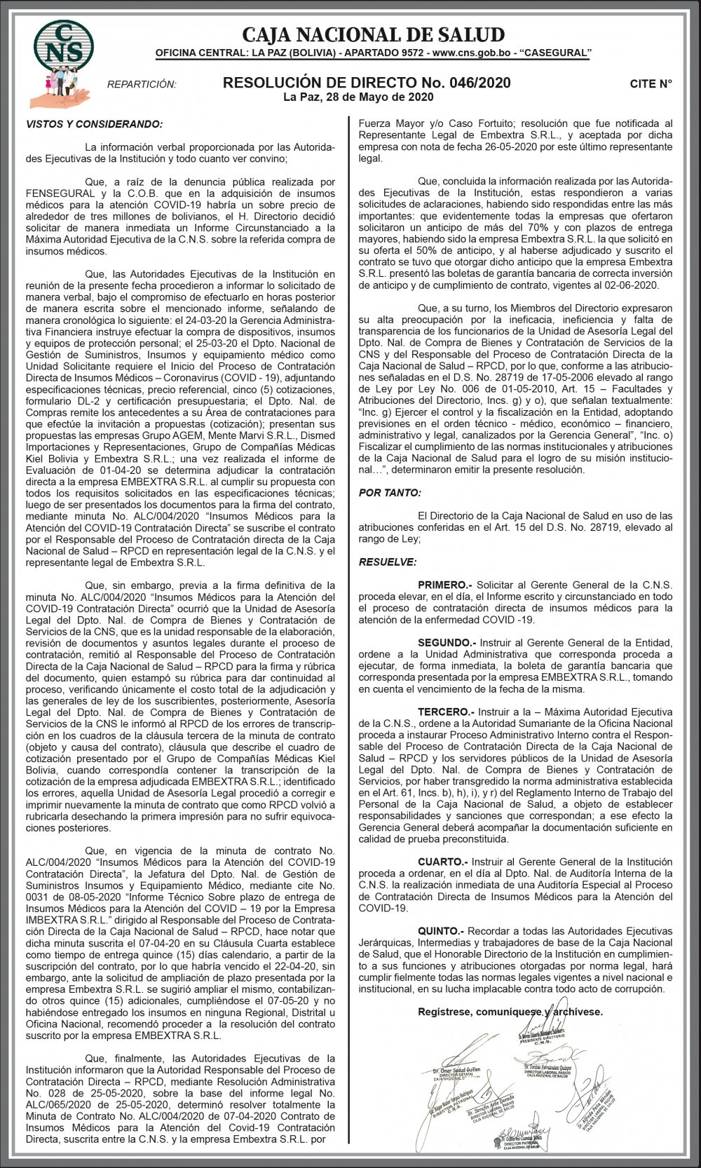 RESOLUCIÓN DE DIRECTO No. 046/2020