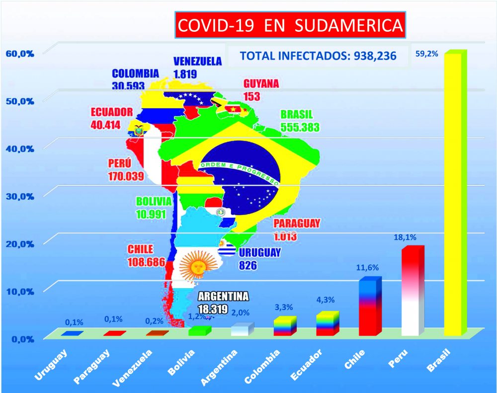 Entre los países sudamericanos afectados por el nuevo coronavirus figuran, después de Brasil, Perú, Chile, Ecuador, Colombia, Argentina, Bolivia, Venezuela, Paraguay y Uruguay.