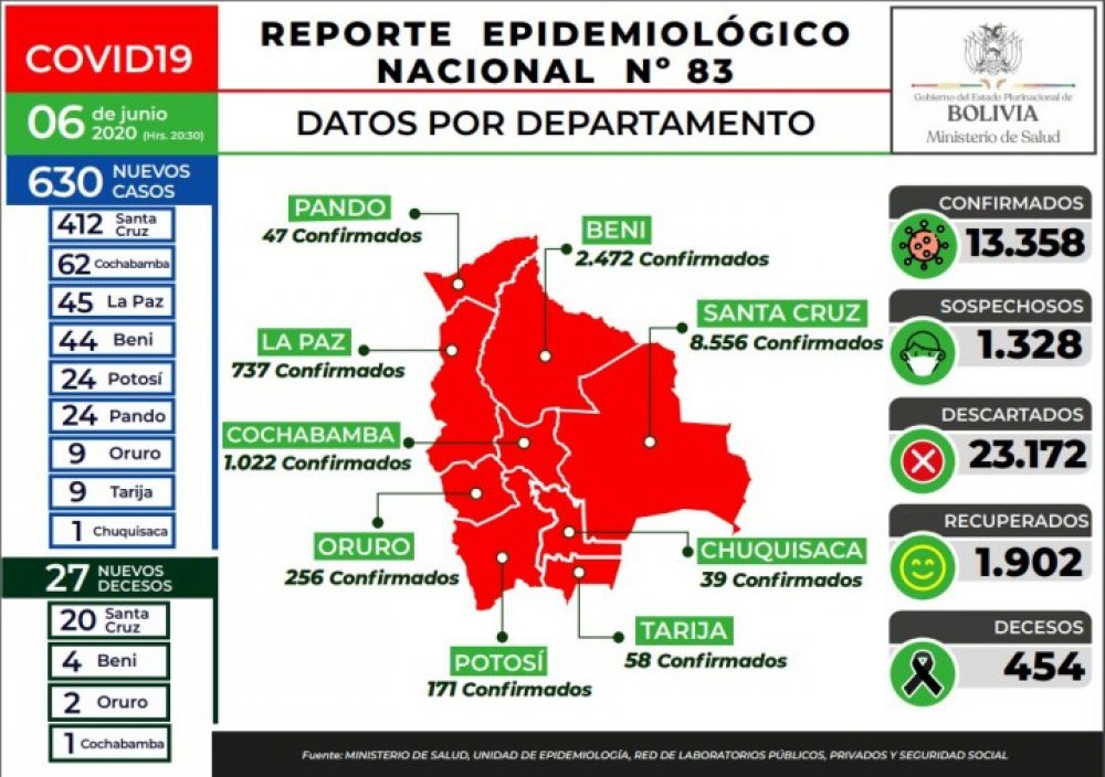 Según reporte del Ministerio de Salud, dado a conocer después de las 22:00 horas del sábado, Bolivia registró 630 nuevos casos y 27 decesos por Covid-19, haciendo que la cifra total de infectados suba a 13.358. Beni registra un descenso, mientras que Santa Cruz sigue liderando los contagios.