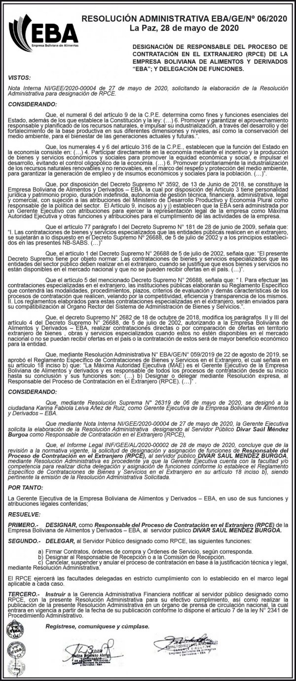 DESIGNACIÓN DE RESPONSABLE DEL PROCESO DE CONTRATACIÓN EN EL EXTRANJERO (RPCE) DE LA EMPRESA BOLIVIANA DE ALIMENTOS Y DERIVADOS “EBA”; Y DELEGACIÓN DE FUNCIONES....