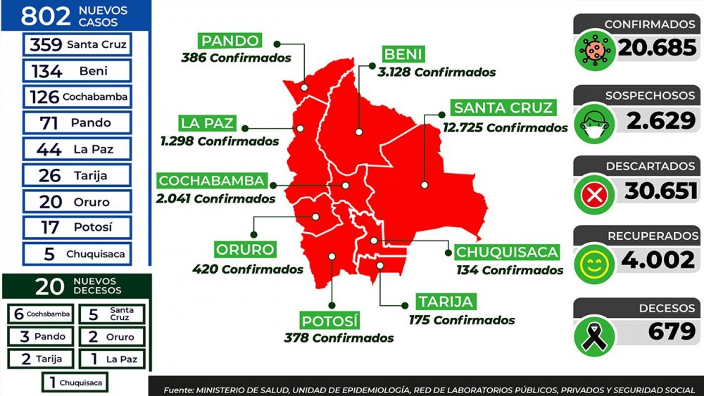 “Hasta las 21.00 de ayer, se reportaron 802 nuevos contagios de coronavirus, teniendo el total de 20.685 personas contagiadas en todo Bolivia", según los datos del Sistema de Información de Vigilancia Epidemiológica.