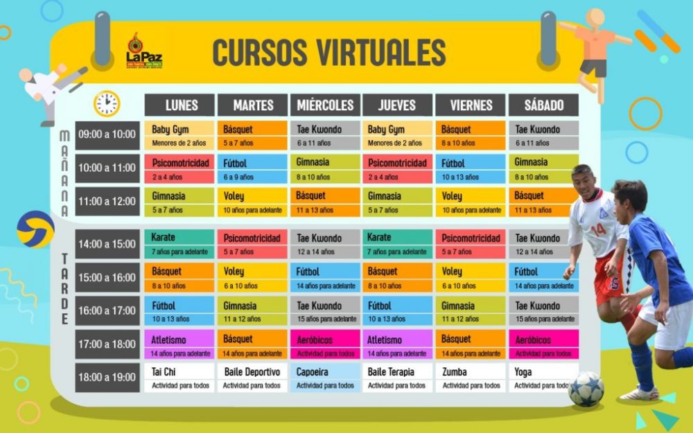 “En esta nueva fase no queremos tener más actividades de manera esporádica sino tener programas de lunes a sábado en actividades tradicionales y deportes muy diversos para los diferentes grupos y edades”, explicó la directora Municipal de Deportes, Janet Ferrufino. Cada curso será de una hora, entre las 09.00 y 19.00, las actividades se extenderán por un mes en Facebook y YouTube, con el nombre: ‘Dirección de Deportes GAMLP’.