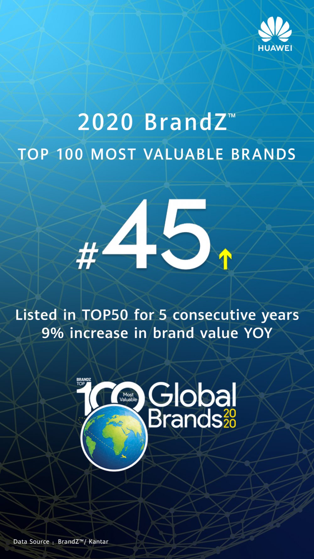 Bolivia, julio de 2020.- Huawei se mantiene firme en su compromiso con la innovación y en el valor que aporta a los consumidores de todo el mundo. En el último estudio sobre “Las 100 Marcas Más Valiosas” de BrandZ, publicado por WPP y Kantar, ocupa el puesto 45, subiendo dos lugares en comparación con el año pasado, con un valor de marca de $29,400 millones de dólares (un incremento del 9% anual).