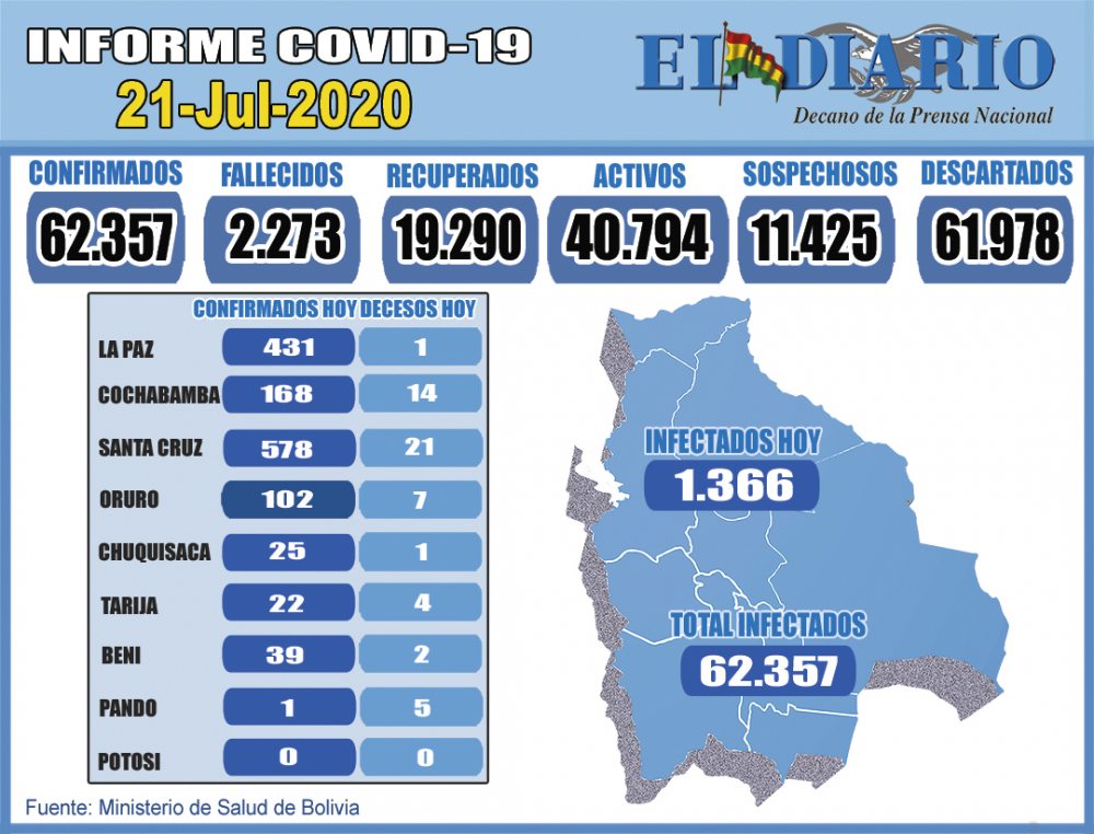 La jornada del martes Bolivia registró 1.366 nuevos casos positivos de la pandemia de Covid-19, con los que el total sube a 62.357 y el número de fallecidos, con 55 registros, se elevaron a 2.273.
