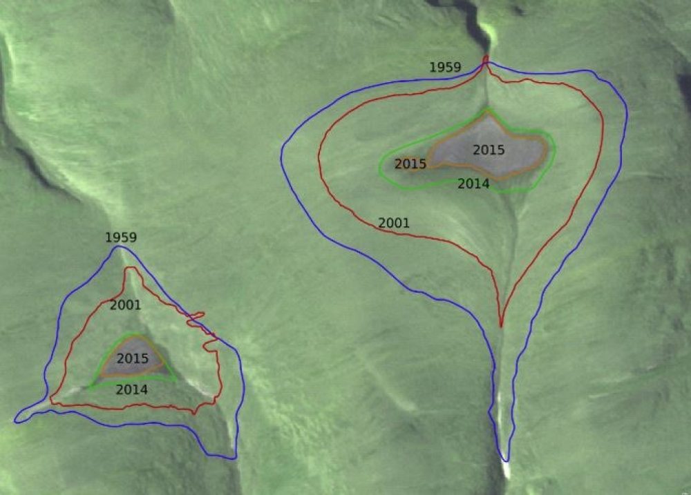 En 2017, los científicos compararon los datos satelitales de Aster de julio de 2015 con fotografías aéreas verticales tomadas en agosto de 1959. Descubrieron que entre 1959 y 2015, las capas de hielo se habían reducido a solo el cinco por ciento de su área anterior, y se redujeron notablemente entre 2014 y 2015 en respuesta al verano especialmente cálido en 2015. Las capas de hielo están ausentes de las imágenes de Aster tomadas el 14 de julio de 2020.