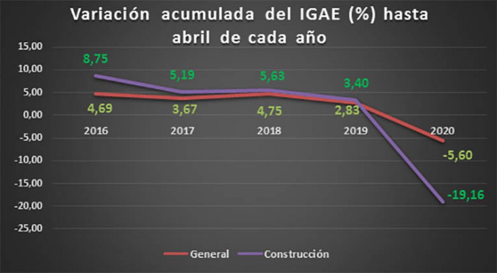 Los datos del IGAE acumulados hasta el mes de abril evidencian los efectos de las medidas de la emergencia sanitaria, como la caída del índice global de toda la economía en 5,60% en comparación con el mismo período del año 2019.