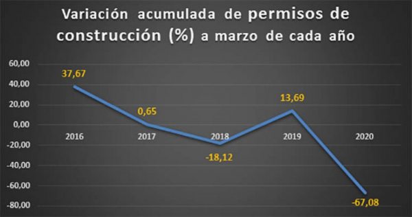 Entre enero y marzo de 2020 (datos oficiales disponibles) los municipios otorgaron permisos de construcción para una superficie de