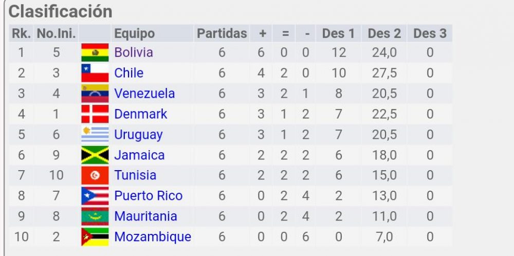 Bolivia está a una sola victoria de ascender por primera vez a la División 2 de la Olimpiada Mundial virtual de ajedrez que se disputa a través de la aplicación Lichess gracias a que este sábado se impuso en las tres rondas sobre Jamaica, Dinamarca y Mozambique, con lo que es líder invicto del Grupo D de la División 3 con 12 puntos.