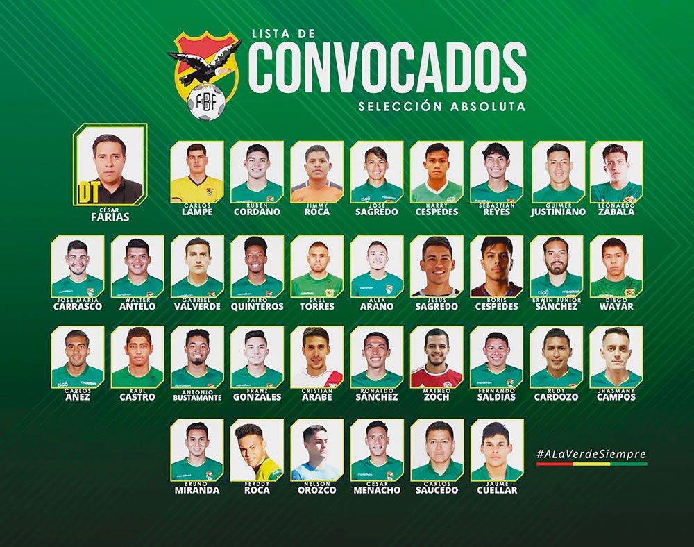 El director técnico de la Selección Boliviana de Fútbol, César Farías, dio a conocer la nómina de convocados el cual componen 34 futbolistas que trabajarán con miras a la preparación de la Verde para las Eliminatorias mundialistas de Catar 2022. La base de esta convocatoria está compuesta por el elenco Sub-23, que participó en el certamen pre Olímpico. Con miras a octubre, el timonel venezolano dio a conocer la lista de elegidos que trabajarán en su primer encuentro luego de varios meses por la cuarentena a raíz del coronavirus. El plan de Farías es retornar al ritmo de los futbolistas en micro labores con el afán de recuperar tiempo antes del inicio de las Eliminatorias. En la lista se destacan las convocatorias de Jaumé Cuéllar y Boris Céspedes, jugadores que destacaron su participación en sus clubes de Italia (Spal) y Suiza (Servette), respectivamente. Céspedes se convirtió en el primer jugador boliviano en debutar en la Serie A del fútbol italiano con el club SPAL. A sus 19 años, el futbolista aspira a llegar a su mejor nivel, por lo que Farías apuesta en su trabajo. Por su parte, Céspedes, de 25 años, jugó en el Servette de Suiza, siendo aporte para la clasificación de su equipo a la Europa League. Además, Leonardo Zabala, quien milita en la Sub-20 del Fluminense tendrá la oportunidad de practicar con la selección absoluta. De esta convocatoria quedaron fuera jugadores del club Bolívar y Wilstermann, equipos que priorizan su trabajo en la Copa Libertadores, salvo el futbolista Jairo Quinteros, quien concentrará con la Verde.