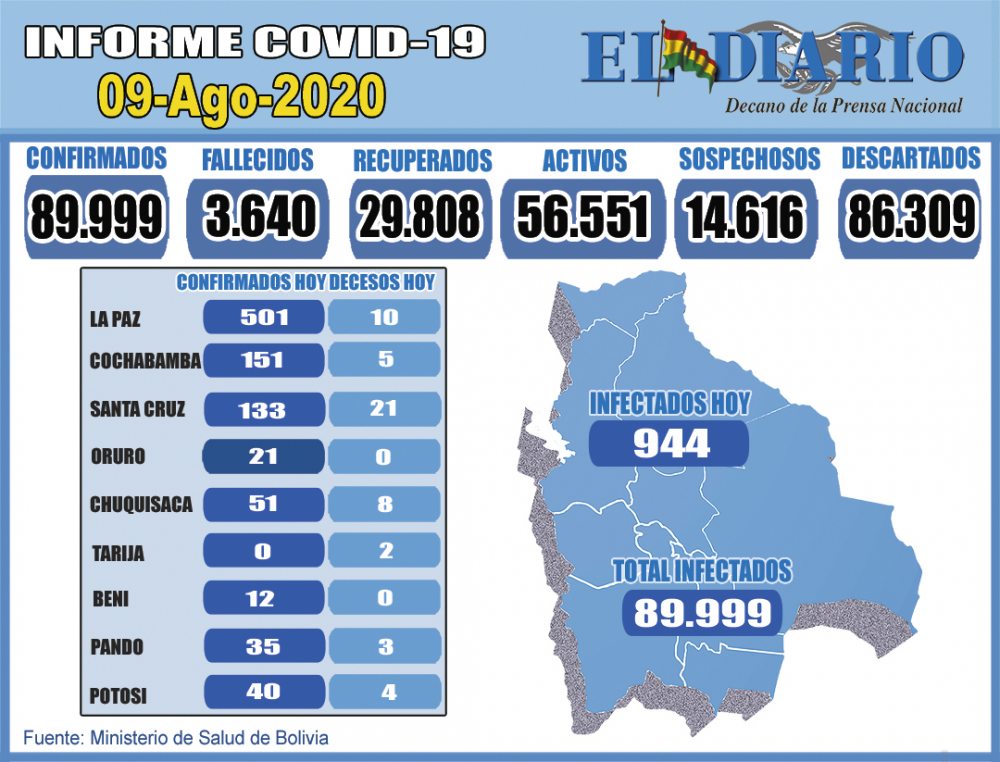 Entre los nuevos casos figuran 501 en La Paz, 151 en Cochabamba, 133 en Santa Cruz, 51 en Chuquisaca, 40 en Potosí, 35 en Pando, 21 en Oruro, 12 en Beni y Tarija sin casos.