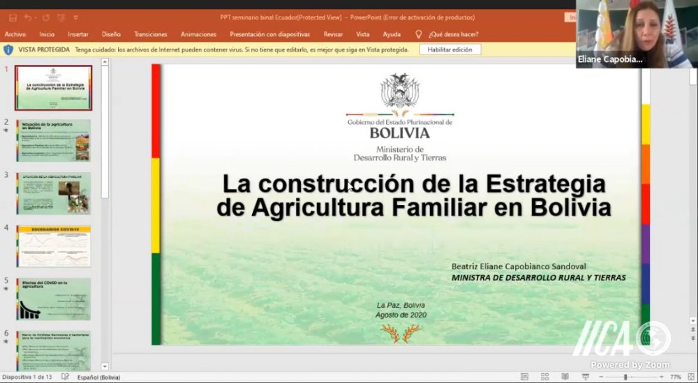 La ministra de Desarrollo Rural y Tierras, Eliane Capobianco, fue la encargada de presentar las acciones que Bolivia viene desarrollando, con el fin de reactivar al sector agropecuario y fortalecer la seguridad alimentaria, esto, en el marco de su participación en el Seminario Virtual Binacional, “Agricultura Familiar y Desarrollo Rural” organizado por la Embajada del Ecuador en Bolivia.