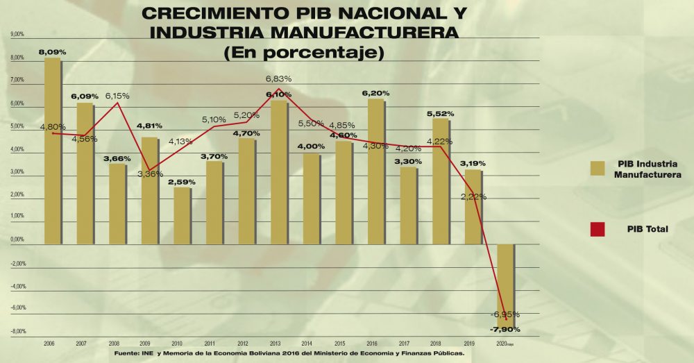 A mayo de 2020, la tasa de crecimiento de la economía boliviana, producto del impacto de Covid-19, llegó a -7,9 %, cuando a fines de 2019 se situó en 2,22 %, una caída de más de 10 puntos porcentuales, y los datos de la mayoría de las cifras macroeconómicas tienen tendencia negativa.