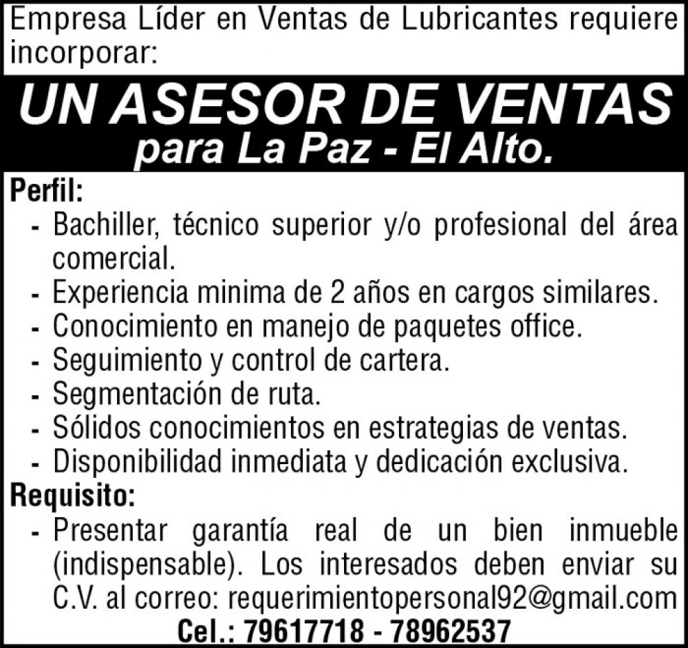 Empresa Líder en Ventas de Lubricantes requiere incorporar: