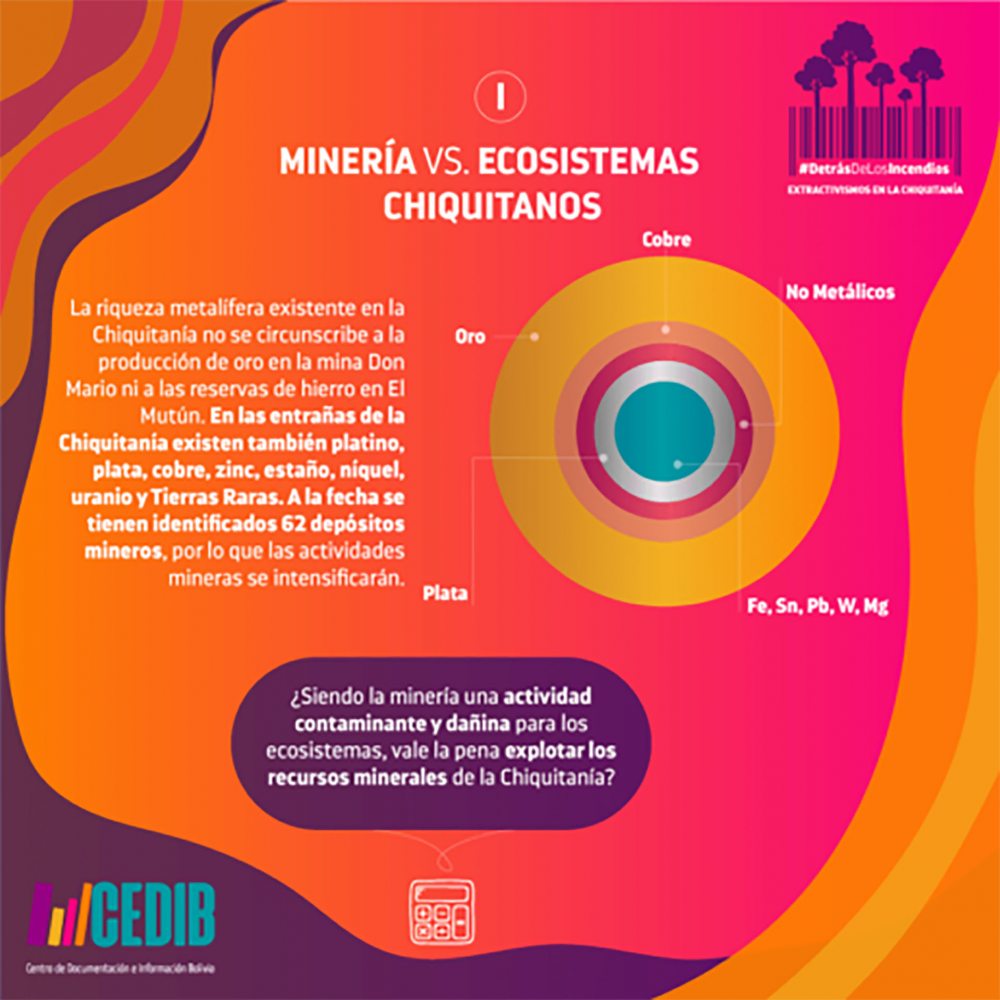 El Cedib publicó un documento titulado qué deja la minería de oro en la Chiquitania, en donde señala que no es una región minera, pero la explotación del metal precioso, exceptuando algunas labores artesanales y esporádicas, data de mediados de los años 90.