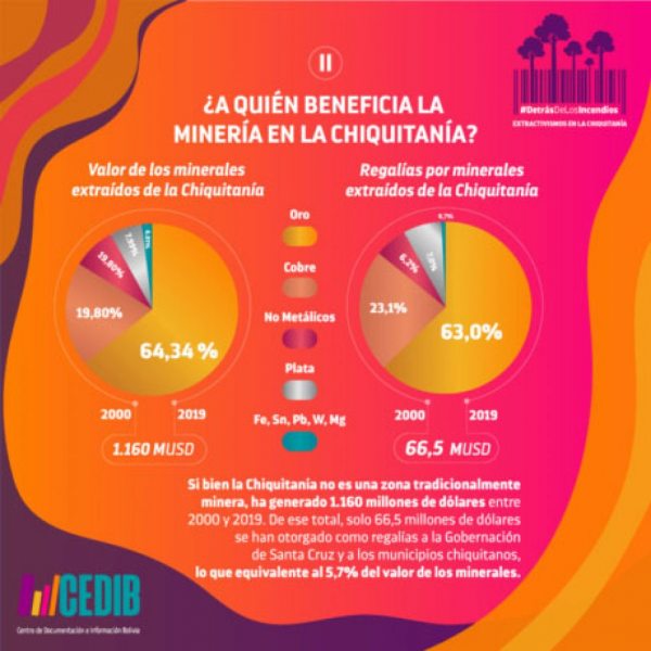 Toda la actividad minera realizada en la región Chiquitania ha generado 1.160 millones de dólares en el periodo 2000 – 2019. De ese total, las regalías otorgadas a la Gobernación de Santa Cruz y a los municipios chiquitanos sólo han sido 66,5 millones, que es equivalente al 5,7 % del valor de los minerales.