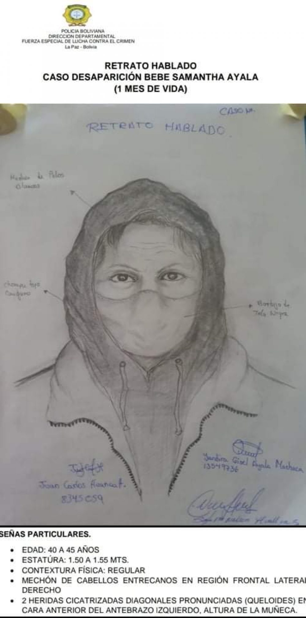 La policía realizó el dibujo de un retrato hablado de la mujer donde se la identifica que tendría tez blanca, una estatura de 1.55, y una contextura regular, de entre 40 a 45 años de edad, un mechón blanco en el cabello y cicatrices en la mano izquierda.