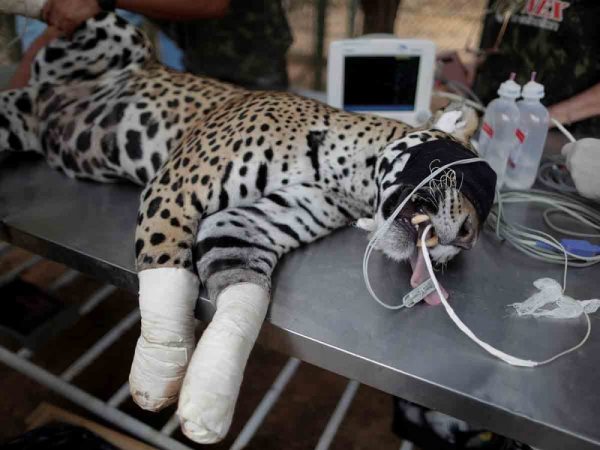 Corumbá de Goiás (Brasil).- Un jaguar enjaulado, golpeado por un dardo tranquilizante, se eleva con un gruñido de dolor sobre sus patas quemadas y vendadas.