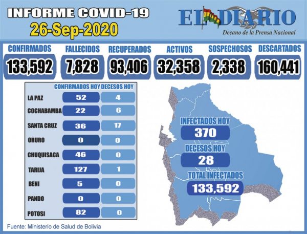 El Ministerio de Salud reportó el sábado que los contagios por el nuevo coronavirus se elevan a 133.592, con los 370 nuevos casos positivos en el país y el número de decesos sube a 7.828 con los 28 registros. Entre los...