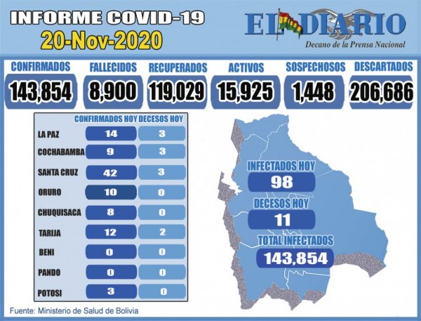 El Ministerio de Salud reportó el viernes 125 nuevos contagios por coronavirus, con los que el total sube a 143.854 en el territorio nacional y con 11 fallecidos se eleva a 8.900. Entre los nuevos casos figuran 42 en Santa Cruz, 14 en La Paz,...