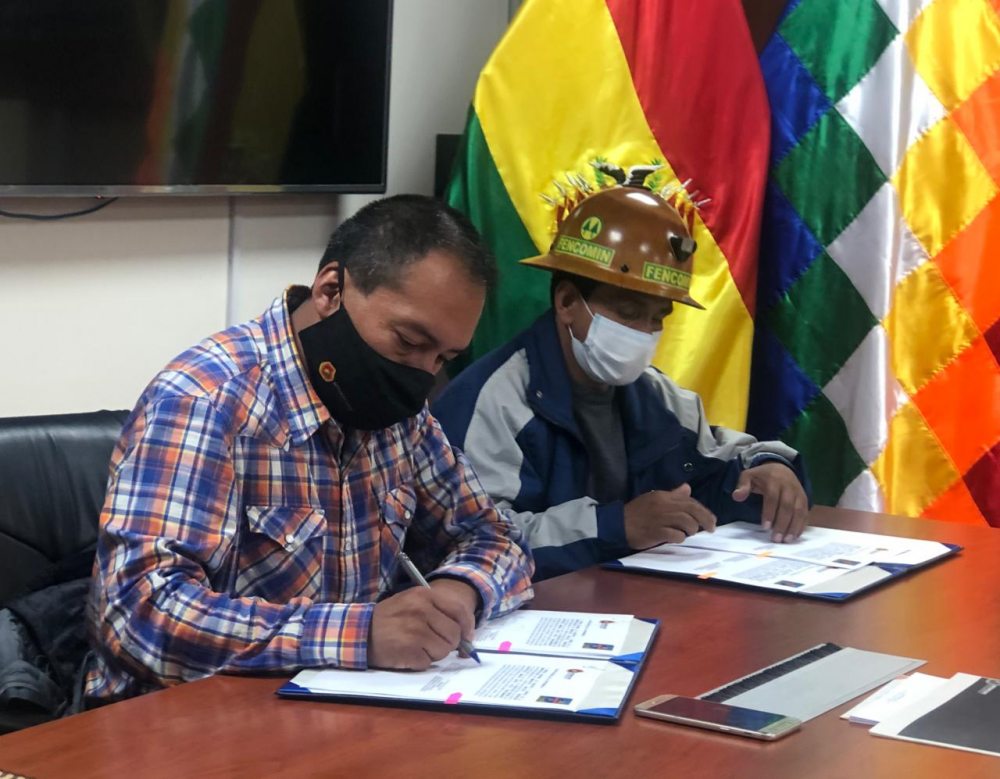 La firma de convenio tuvo lugar en el auditorio del Senarecom, con la presencia de dirigentes mineros de la Federación Nacional de Cooperativas Mineras de Bolivia (Fencomin) y Ferecominorpo, entre otros.