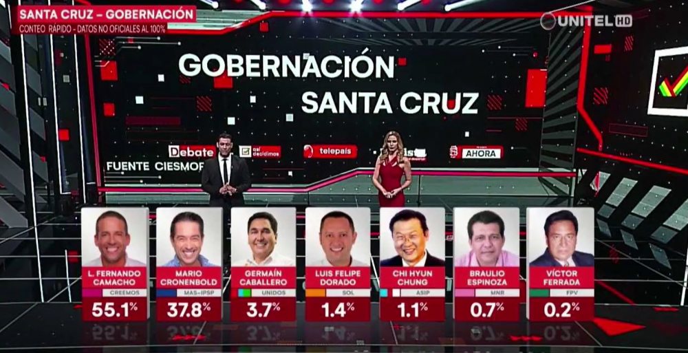 En Santa Cruz, las encuestas, no oficiales, dieron como ganador a Luis Fernando Camacho con un 55.4 % de apoyo con respecto a su inmediato seguidor, Mario Cronembold, que alcanzó solamente un 34.3 %, lo que le otorgaría la victoria al candidato a la gobernación cruceña por la agrupación Creemos.