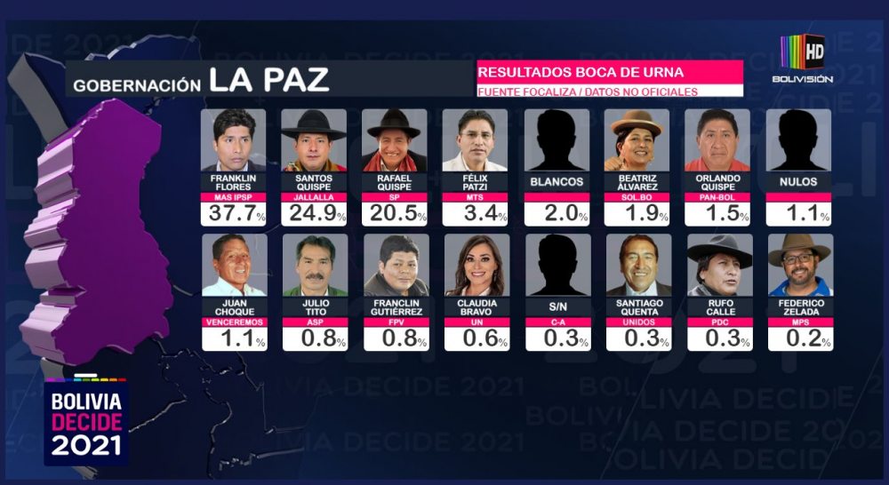 En el departamento paceño, los resultados de la encuesta en boca de urna expresaron que el candidato del Movimiento al Socialismo, Franklin Flores, alcanzó un 37.3 % de la votación, mientras que Santos Quispe de Jallalla llegó al 27 %, lo que sugiere una segunda vuelta entre esta dos fuerzas políticas, en caso de confirmarse los resultados en el recuento oficial.