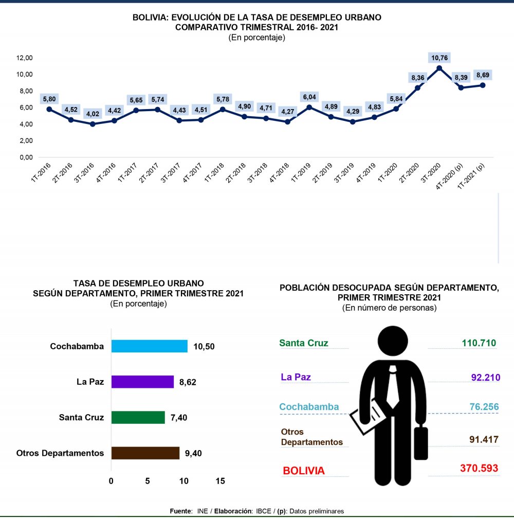 Al primer trimestre del 2021, la tasa de desocupación urbana registró 8,69%, siendo Cochabamba el Departamento con la mayor incidencia (10,5%), seguido de La Paz con 8,62%, Santa Cruz (7,40%), mientras que el resto de los Departamentos en conjunto registraron 9,40% de desempleo.