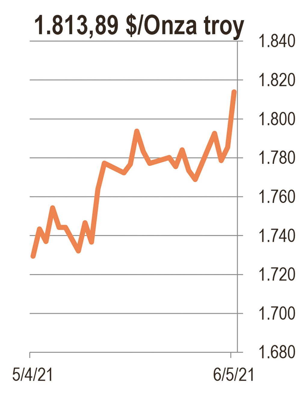 Los precios del oro subieron, el jueves, por encima del valor psicológicamente significativo de US$ 1.800 la onza troy por primera vez desde febrero, debido a la reciente caída de los rendimientos de los bonos estadounidenses y un dólar ligeramente más débil. El alza se presenta a pesar de una caída en la demanda de India, el segundo mayor consumidor mundial, debido a la ferocidad de la pandemia que está fuera de control en ese país. |