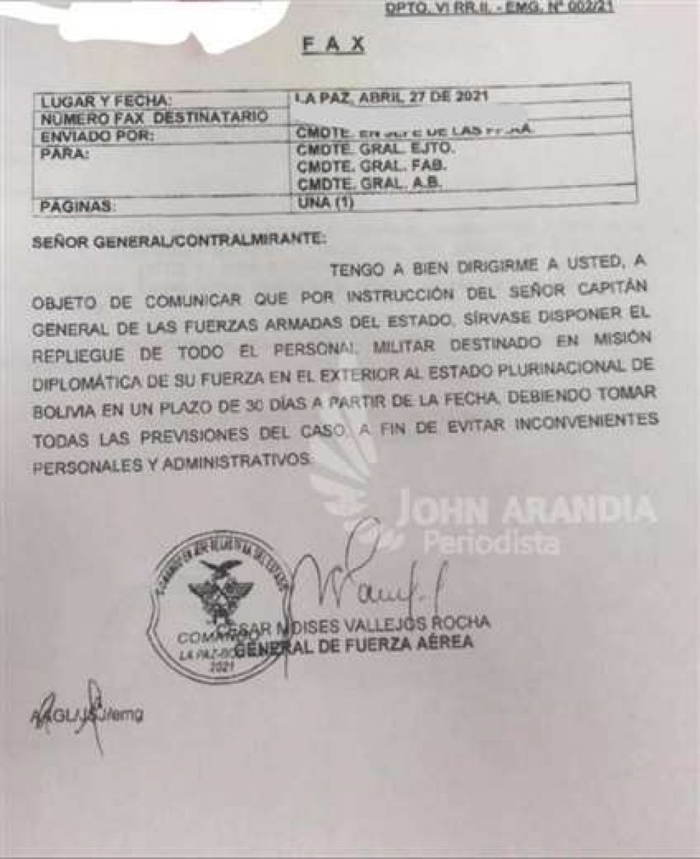 “Tengo a bien dirigirme a usted a objeto de comunicar que por instrucción del señor Capitán General de las FFAA del Estado, sírvase disponer el repliegue de todo el personal militar destinado en misión diplomática de su Fuerza en el exterior al Estado Plurinacional de Bolivia en un plazo de 30 días”, se lee en la nota firmada por el general de la Fuerza Aérea, César Vallejos, comandante en jefe de las FFAA, dirigida a los comandantes de las tres fuerzas, Ejército, Aérea y Armada.